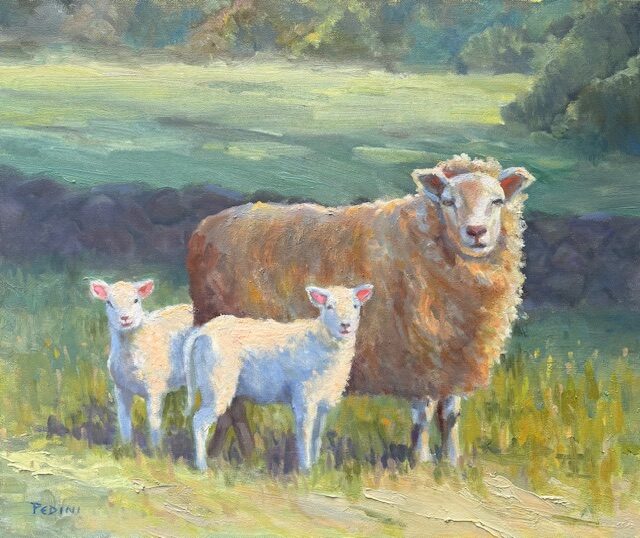 This painting depicts a family of sheep out grazing in the field.