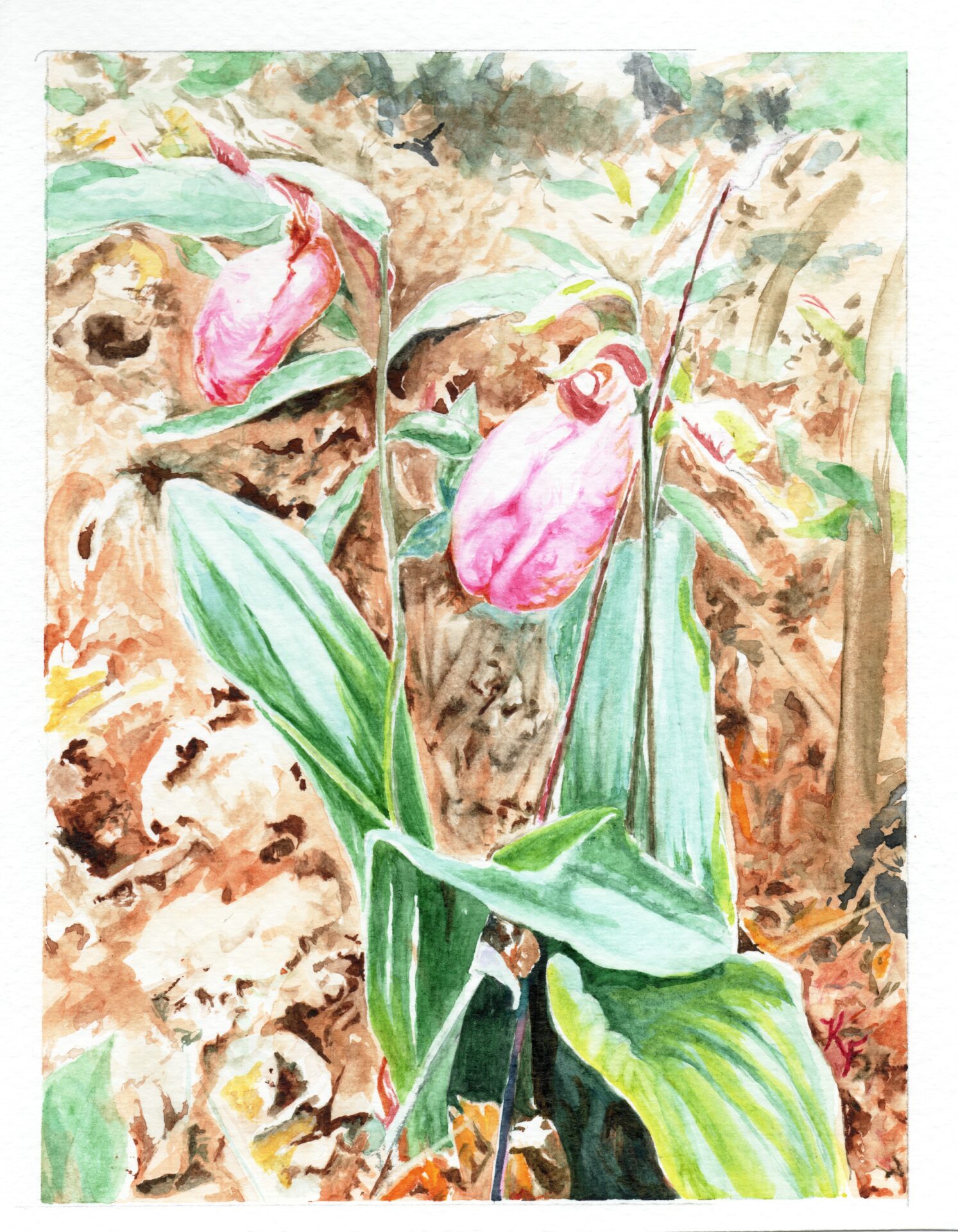 This painting is based on a photograph of mine from a walk in the woods. I love finding native plants in bloom and trying to represent the experience of discovery in a painting. My mother taught me about Lady Slipper plants (also called Slipper Orchids) when I was a girl, so when I found some blooming much later in life, I had to photograph and paint them!