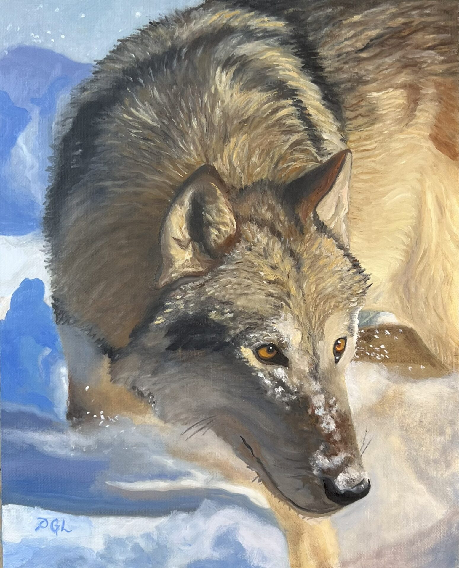 A solitary wolf standing in the glistening snow stares intensely forward, alert and wild, embodying both strength and survival.